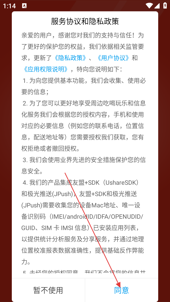 1、首次打开应用,阅读服务协议弹窗后点【同意】,进入首页。