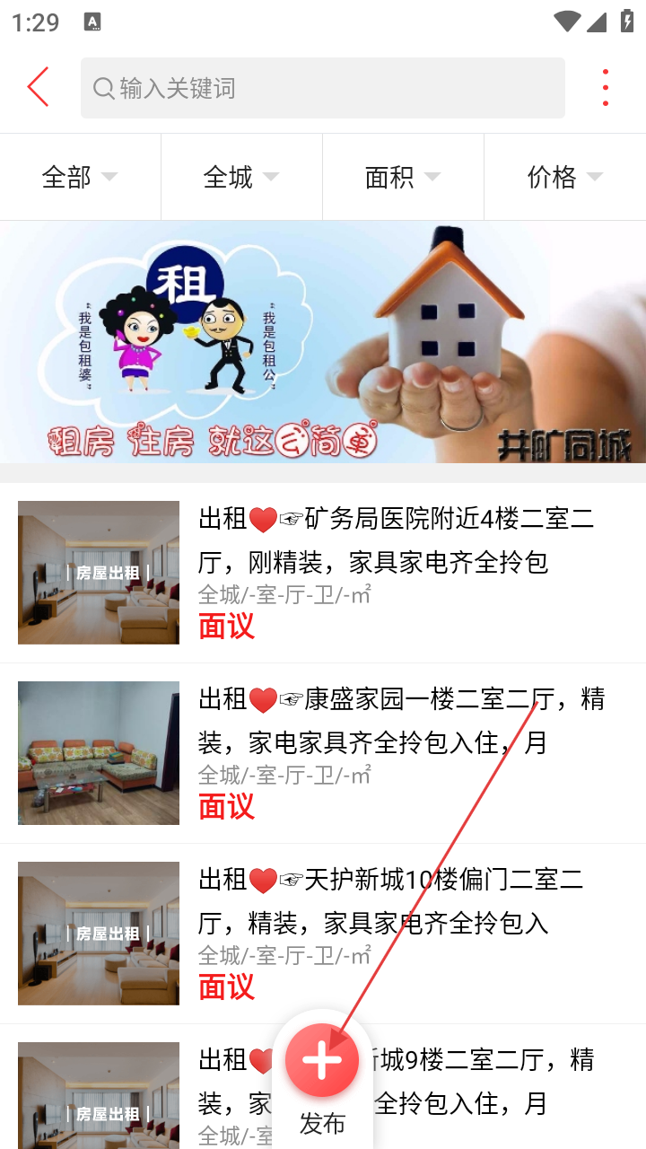 2、在首页点【房屋出租】,进入租房信息列表页。