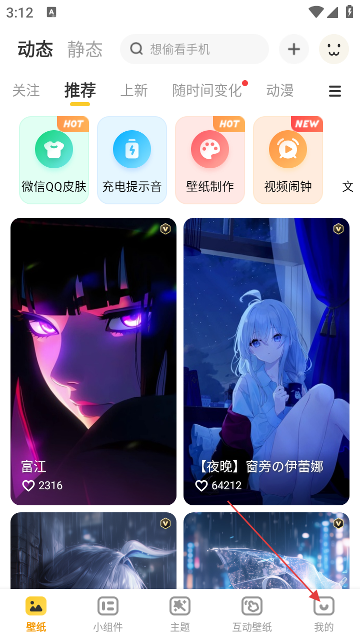 1、打开元气桌面壁纸APP,在壁纸页面可浏览各类壁纸,点击右下角【我的】进入个人页面。