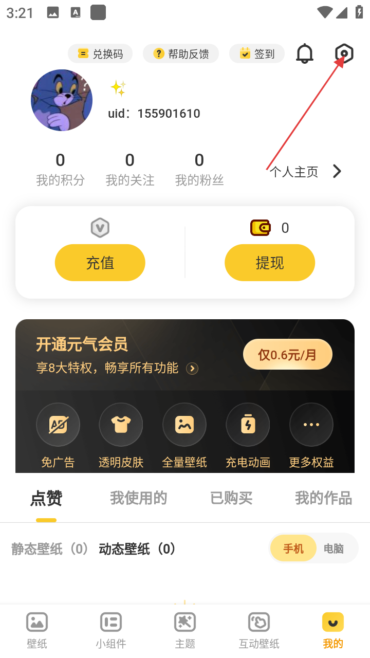 2、在个人页面,能看到积分、关注等信息,点击右上角设置图标进入设置页面。