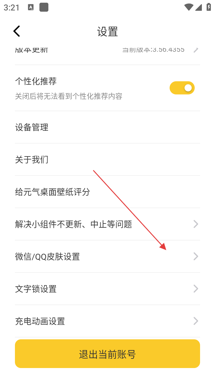 3、在设置页面,有个性化推荐、设备管理等选项,点击【微信/QQ皮肤设置】进入对应设置页面。