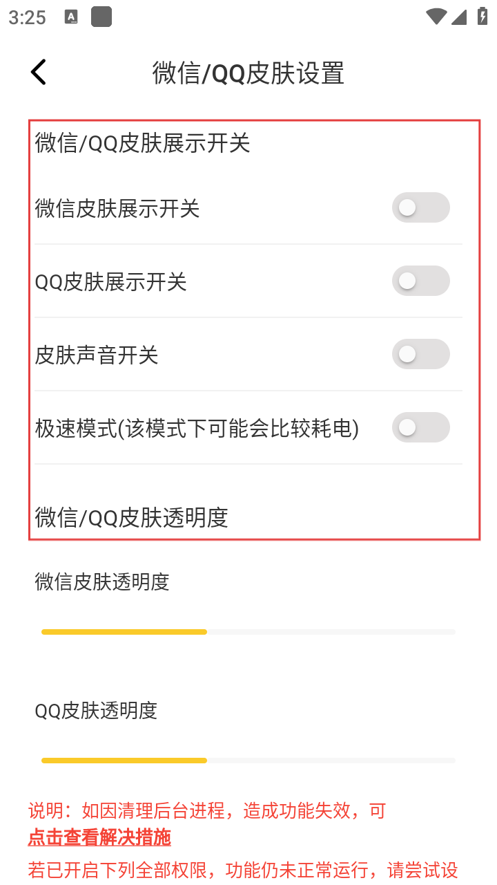 4、在微信/QQ皮肤设置页面,可对皮肤展示开关、透明度等进行设置,打造专属皮肤效果。