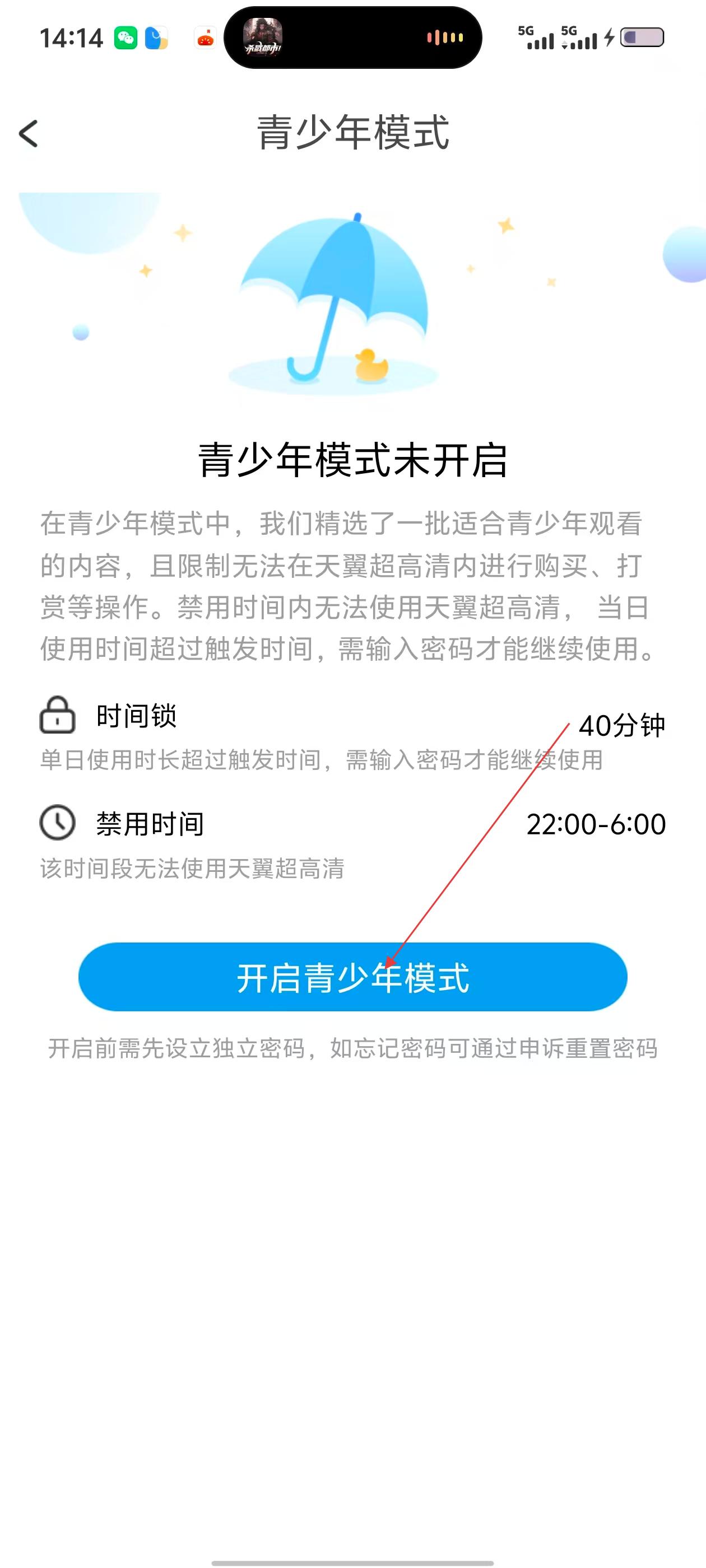 4、在青少年模式设置页面,点击【开启青少年模式】按钮,可开启青少年模式。