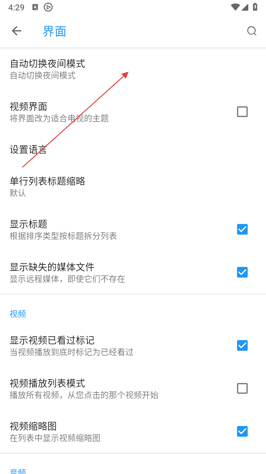 4、在界面设置页面找到【自动切换夜间模式】选项,开启该功能,应用将自动切换夜间模式,提升夜间使用舒适度。