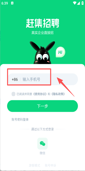 1、阅读协议输入手机号点击“下一步”,自动注册并进入真实企业招聘广场。