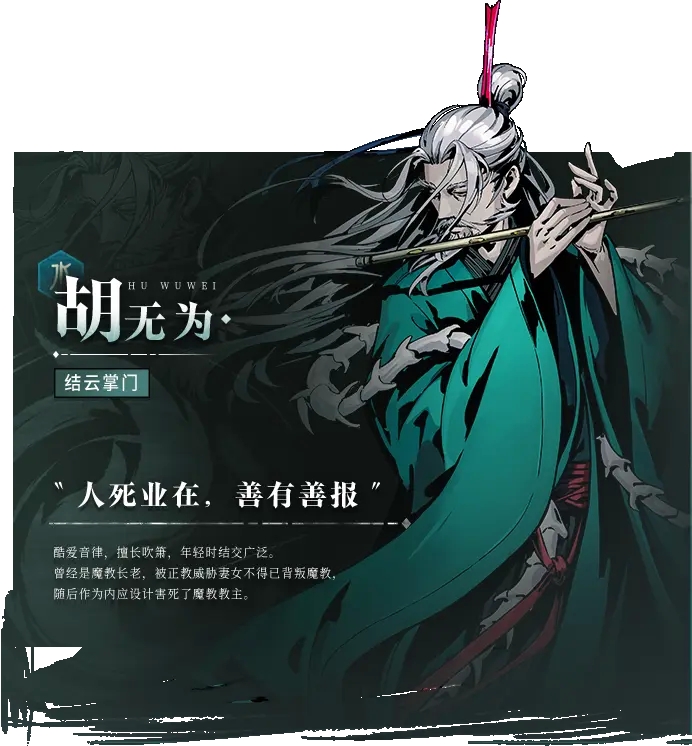 酷爱音律,擅长吹箫,年轻时结交广泛。曾经是魔教长老,被正教威胁妻女不得已背叛魔教,随后作为内应设计害死了魔教教主。