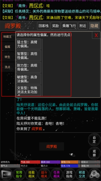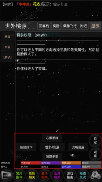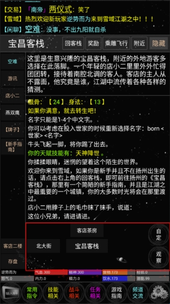 雪域MUD是一款以文字为主要表现形式的武侠题材角色扮演游戏,玩家将从一位初入江湖的无名小卒出发,通过探索、修炼、战斗和互动等方式逐步成长,学习多门武功秘籍,结识各路豪杰,体验充满恩怨情仇的江湖人生。游戏融合了经典MUD玩法与丰富的武侠世界观,剧情发展自由,角色成长多样,为玩家带来沉浸式的代入感与策略乐趣。