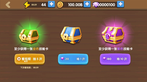 3、还可以使用钻石进行抽卡,有一定的几率可以获得金色或者紫色技能卡。