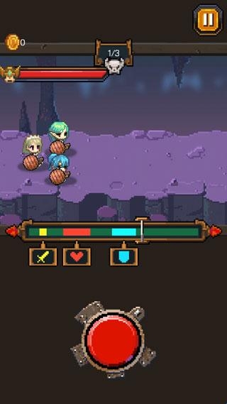 5、如果觉得金币不够用,那么我们可以选择去洞窟探索。整个探索过程,我们可以遇见三批敌人,每次敌人来之前,我们都可以使自身获得一个提高,也就是在上面的那个进度条指到相应的颜色区域时,按下红色按钮,在每一波敌人出现之前可以按下三次。蓝色可以增加防御力,黄色可以增加攻击力,红色可以增加体力。在探索完毕以后,也有一定