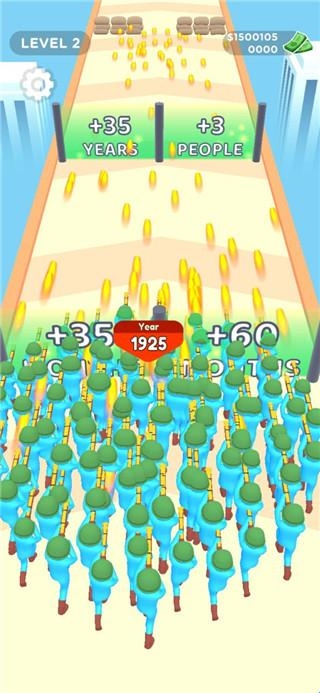 人群进化是一款融合跑酷、射击与策略元素的创意动作游戏,玩家将带领一群蓝色小人穿越时空,从原始社会一路冲向未来科技时代。游戏采用简洁而富有趣味性的3D卡通画面,随着时间的推进,你的角色形象也会不断变化,从拿着木棒的远古人到挥舞激光枪的未来战士,每个阶段都带有独特的武器和装束,极具视觉趣味。