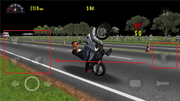2、屏幕右边第一个动作是摩托车头翘起来,和驾驶一起按就是车头翘起前进的特技。