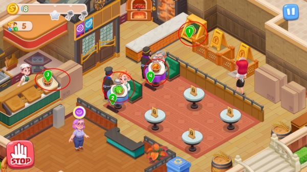 4、点击餐桌上的“厨师”标志,再根据客人所需配菜,点击配菜位置再点击客人,依顺序送达