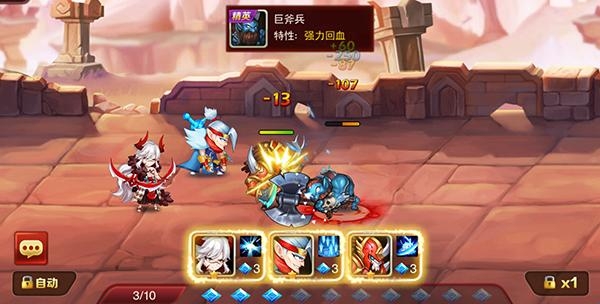 在开始战斗后,游戏英雄会自动向前走动,遇到敌人会自动攻击。玩家也可以点击左下角的自动,让英雄们全程自动战斗,解放双手,但是需要通过第一章所有关卡才能解锁哦!