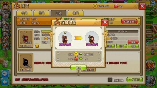 2、村长大人可以在兵营内为相应兵种升星。兵种升星后会大幅度提高三围属性(生命、攻击、力量)。与武将一样,兵种最多能升到5星。