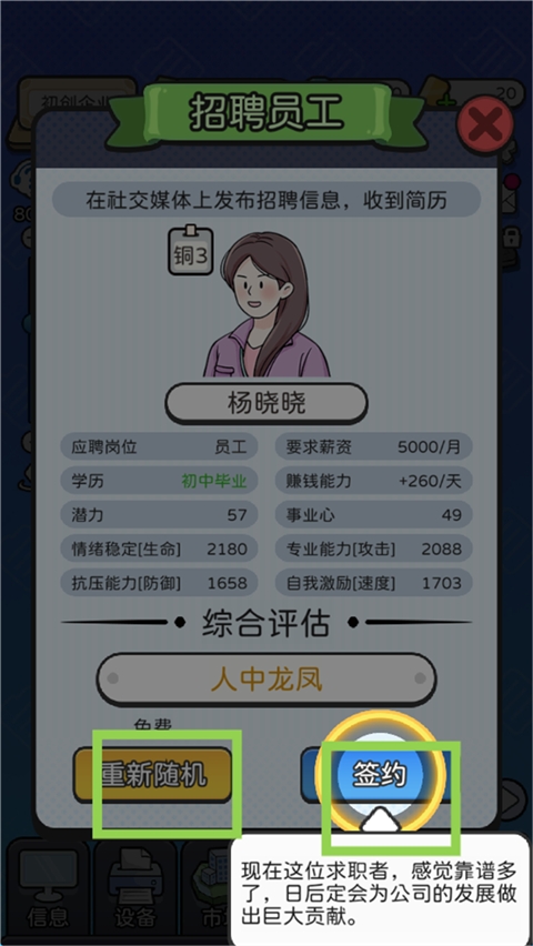 4、招聘员工时不满意可重新随机招募,满意即可签约。