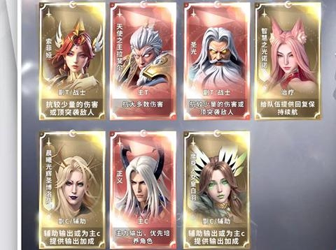 该阵容中的精英伙伴和阿努比斯是游戏前期送的,中途抽到定位相同的伙伴可以直接替换。晨曦光辉圣博洛萨作为少有的远程单点输出,属于主C的最佳人选之一,一些前排较肉的关卡可以比较轻松突破。副C的位置可以用其他类似的输出替换,例如慈悲的老艾德、风语者凯兰崔尔等。