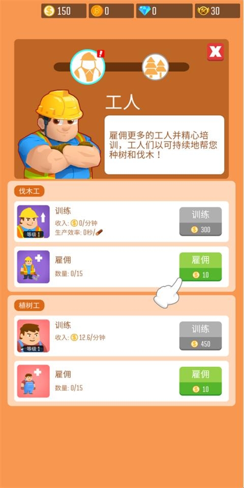 2、雇佣更多的工人并精心培训,工人们以可持续地帮您种植和采集原木。在这里,玩家可以看到伐木工和植树工,并且雇佣的费用不同,接下来我们先雇佣一名伐木工吧!