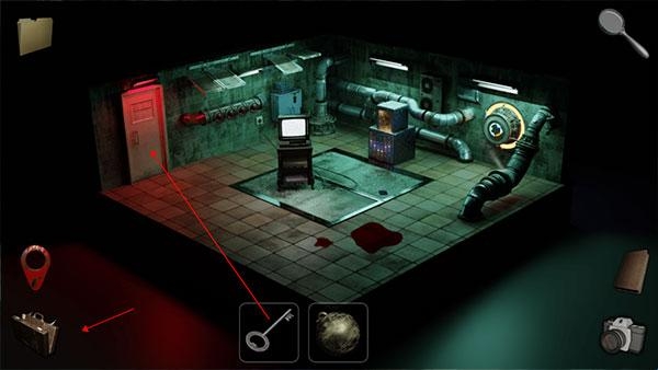 3、打开左下角的背包,获取钥匙,点击打开门,穿过走廊进入另一个房间。