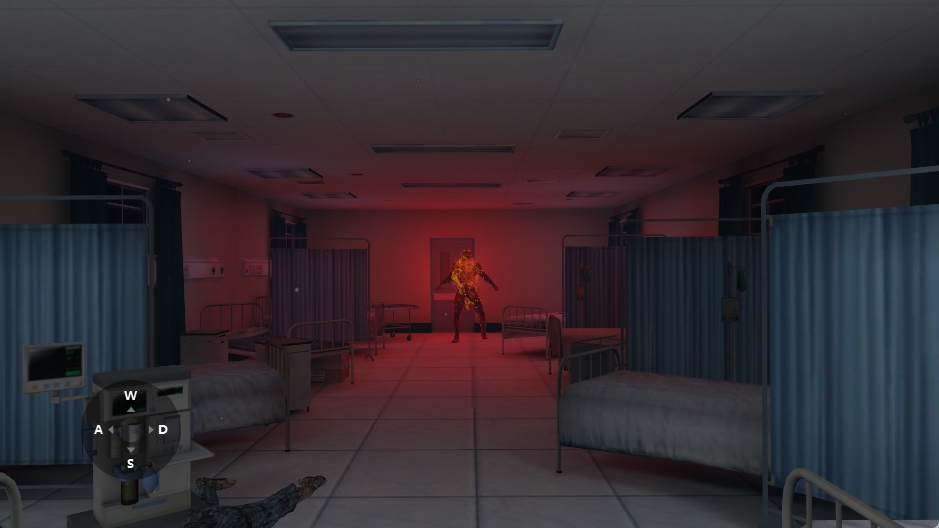 1、在一开始我们来到医院当中,首先左右查看四周,之后走向大门。接着进行瞄准,干掉两个小怪物