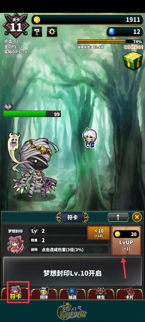 2、想要提升自己的综合实力,点击“符卡”这个功能,然后通过通过一定数量的金币来提升自己的等级,等级越高造成伤害的点越高。