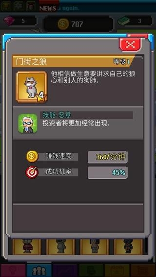 4、一有钱就升级员工等级,因为在不炒股的前期下,员工的投资赚的钱是我们的主要经济来源,所以投资成功率很重要,先把4星的升到百分之50,4星一下先升到40,省钱出效率