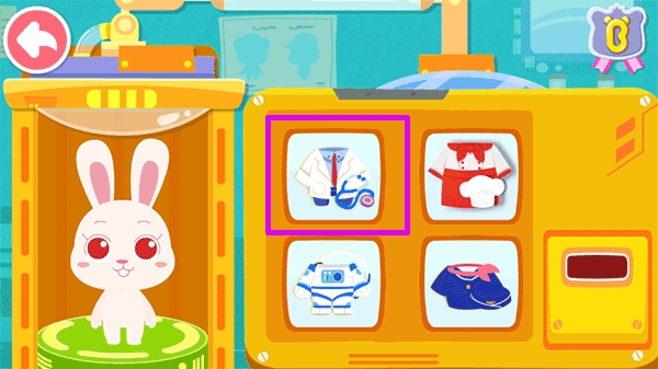 为小厨师戴上厨师帽,帮空乘人员穿好制服,把放大镜和铲子递给考古学家。通过为职业角色换装和挑选工具,了解各职业服装造型,及其常用的工具