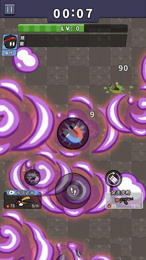 3、滑动中心按钮躲避敌人的攻击,与他们保持一定的距离,英雄会自动射击、自动刷新子弹;