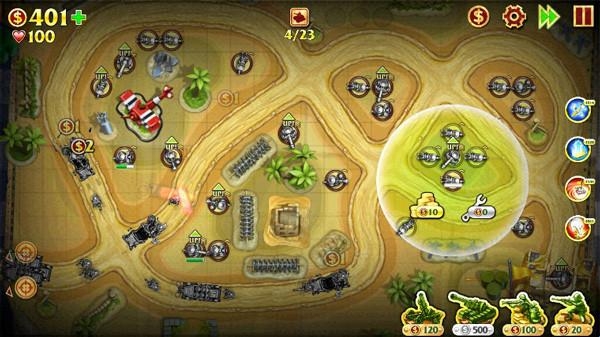 游戏中的防御塔一共有着四种类型,分别为步枪兵(20$)、火焰喷射兵(100$)、加农炮(500$)和防空炮(120$),其中的防空炮只能够用来对付天空中的飞机,对于地面的部队,则不造成伤害,而加农炮的攻击速度比较的慢,又来对付装甲车有着奇效,而步枪兵和火焰喷射兵则是主要用来对于步兵和轻甲车的,其中火焰喷射兵属于AOE伤害