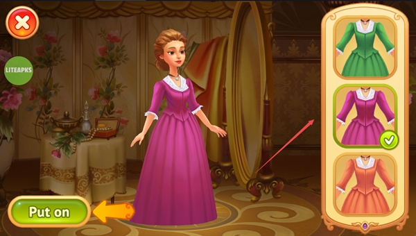 2、你可以选择不同的裙子来装扮角色,点击“put on”进行游戏