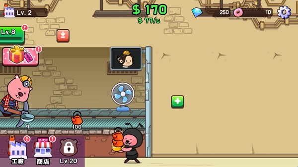 3、玩家可以在游戏过程中不断的升级自己的工厂,每次升级不仅可以提高金钱的获得量,同时还可以增加锤子的力量