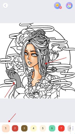 2、点击下方数字,色彩对应的地方会呈现出阴影,再点击阴影部分即可上色。
