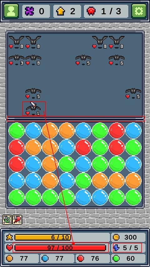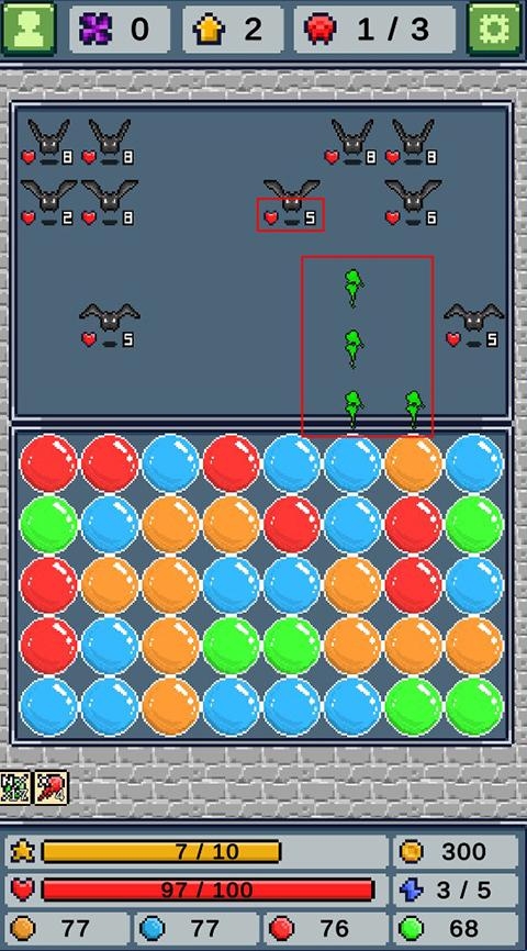 4、玩家在消除的过程中需要注意体力消耗,体力消耗完毕就会进入地方回合,怪物会往前走一格,当怪物走过线时就会攻击我方,扣除血量,当血量被扣完就会失败,需要重新开始。