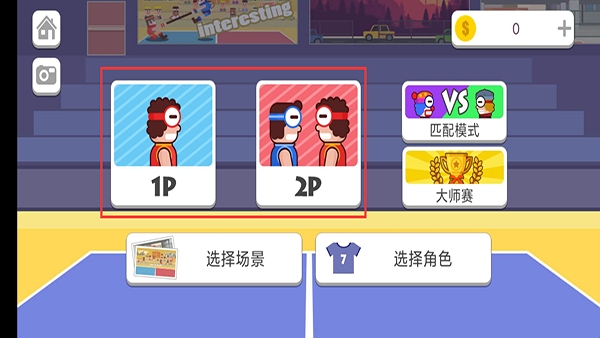 2、可以选择单人还是双人,选择场景和角色,并且可以选择模式,点击“2P”双人模式;