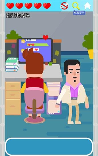 第1关:有提示,点击抽屉拿出电吹风,然后将电吹风拖动到老板的头上即可。