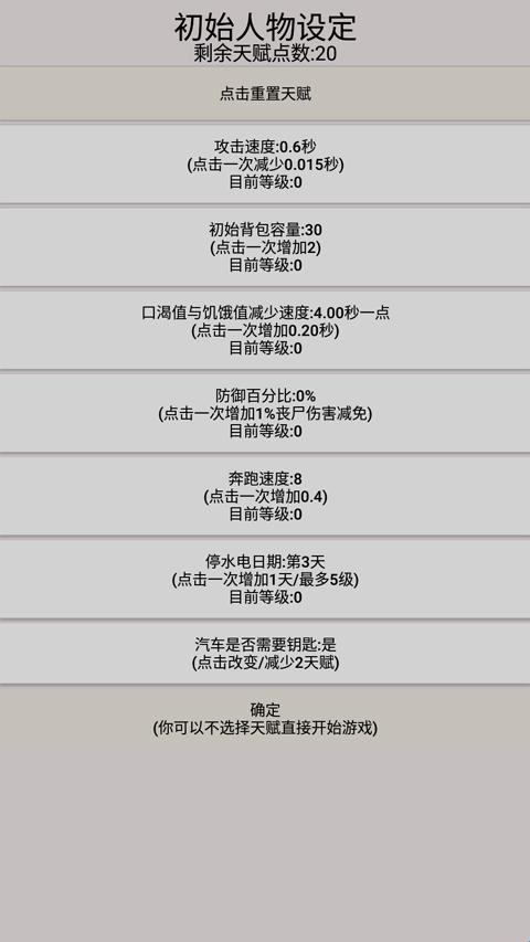 5、然后进行初始人物设定,分配天赋点数,初始拥有20点数;