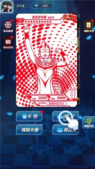 光之英雄巅峰对战是一款奥特曼主题的卡牌对战类的游戏,玩家在游戏中将需要使用钻石来购买卡包,卡包可以随机拆开不同的奥特曼卡片或是怪兽卡片,如果是相同的则可以合成高级的卡片, 每个卡片拥有不同的属性和攻击力,你需要成分发挥自己的战略头脑来组合他们以发挥出最强的战斗力,游戏内容非常丰富,你也来试试吧!