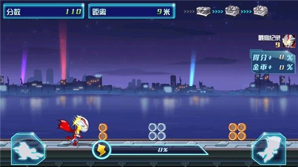 点击左边的虚拟按键控制奥特曼实现下滑动作,而点击右下角的虚拟按钮则可控制奥特曼帅气的弹跳飞跃,沿路除了扰人的障碍之外,还有闪闪发光的金币和贴心实用的道具。