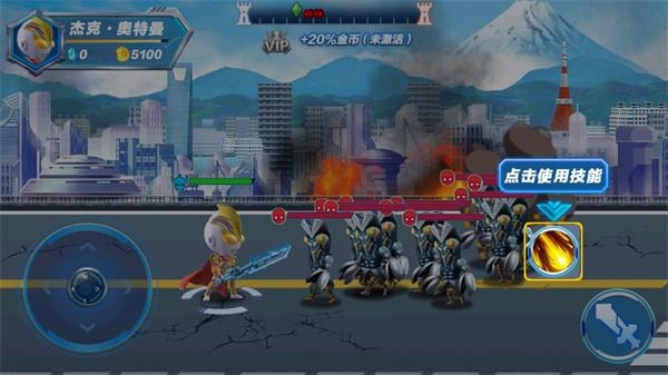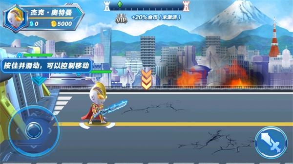 4、玩家需要通过按住并滑动左下角的按钮来控制奥特曼移动;