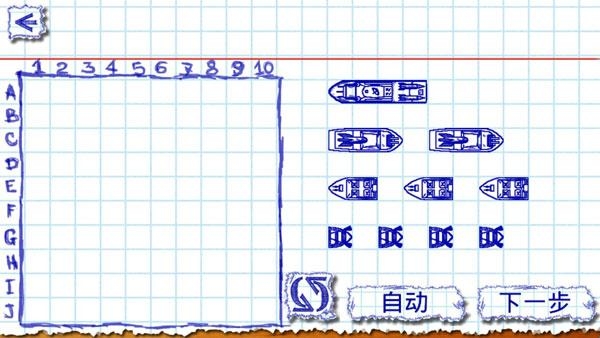 1、安装好海战棋中文版游戏后,我们点击下图中的自动按钮,会自动为我们排兵布阵,也就是说图中的战舰和炮弹都会自动转移到左边这个方格中。