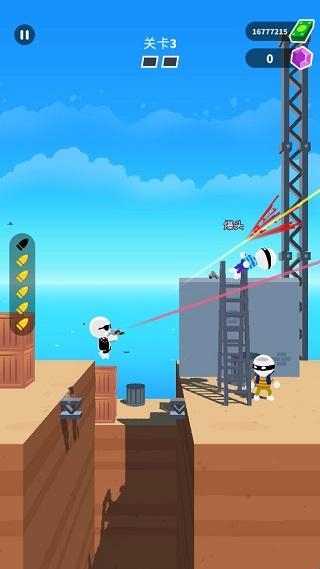 玩家在游戏中操控的是3D小人角色,画风卡通。需要大家做的事情也非常简单,那就是通过跳跃、移动、射击等一系列的操作击杀关卡中的敌人。不过时机的把握也是非常重要,在游戏中,可以根据游戏的激光提示,提前做出预判,当激光快要打到敌人的头部时,快速扣动扳机,但一定要确认你的子弹量可以把剩下的敌人消灭掉!