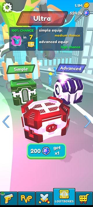 玩家点击屏幕下方宝箱图标就可以进入开宝箱页面,玩家可以随意的打开宝箱不用担心金币不够,以便获取大量的武器装备提升自己。