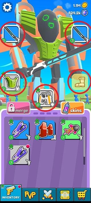 玩家可以点击屏幕左下角的手枪图案进入到升级装备界面,之后点击围绕在机器人周围的五个图案即可进行升级或者购买。
