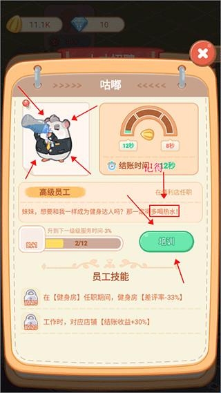 4、接着再点击咕嘟,点击培训,然后他就能上岗帮你赚钱啦