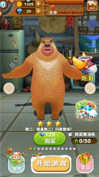 解锁条件:熊二是熊大的弟弟,需要50个西瓜解锁。而西瓜的获得途径是多进行游戏,在游戏中随机获得西瓜奖励。
