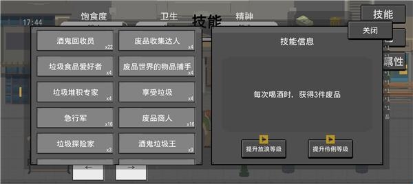 有机会一定要点酒鬼回收员、急行军、酒鬼垃圾王这三个技能,这三加一起就是永动组合。等到度过前期,攒满一次垃圾能得一百块左右时,一般这个时候除了因为不留神导致饱食度或精神度归零外,基本不会死了,遇到这三个技能一定不要犹豫,选就完了。(注意,要计算好该点多少级才能永动)