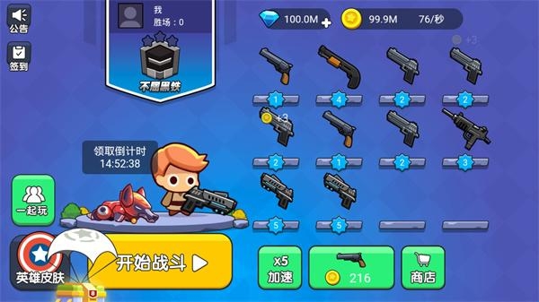 手枪、冲锋枪、暴力枪、狙击枪等传统武器+激光枪、反弹枪、冰冻枪、科技枪、火箭枪等各种创新武器,打法诙谐幽默;