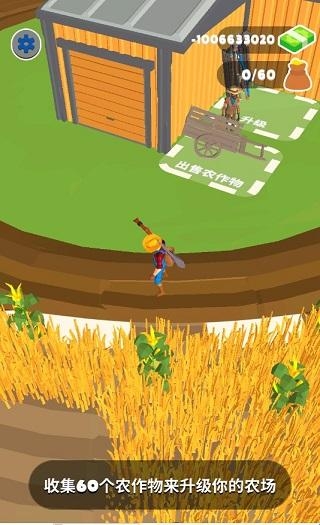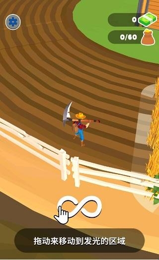 1、拖动手机屏幕来移动角色到发光区域,也就是图中所示的农场位置,进入指定区域,农民伯伯就会自动收割庄稼,新手玩家,先来根据教程要求收获60个农作物到你的口袋。