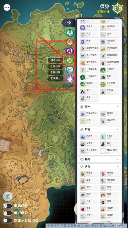 3、提供了包括风神瞳,岩神瞳,宝箱,野外boss,七天神像,NPC,传送点,地灵龛、矿物、秘境等资源点的详细分布位置。
