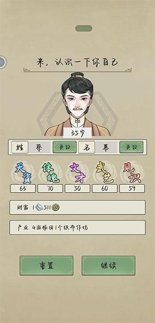 选择随自己姓后的角色无论男女出生子女都是随自己姓,开局人物属性,推荐选择比较中和一点的。天资60-70左右。