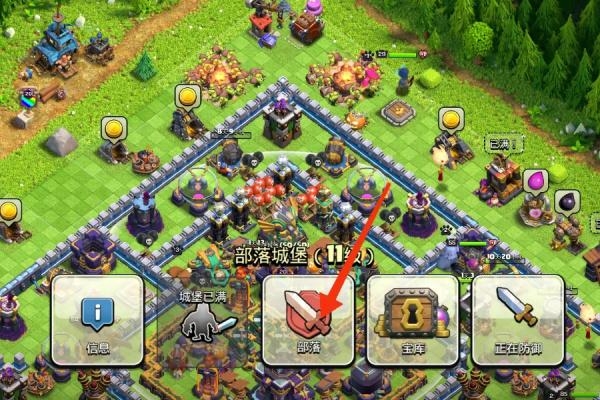 1、在游戏主页找到部落城堡建筑,点击【部落】。